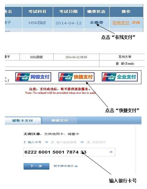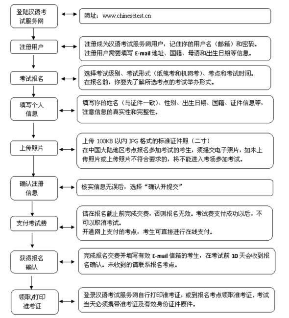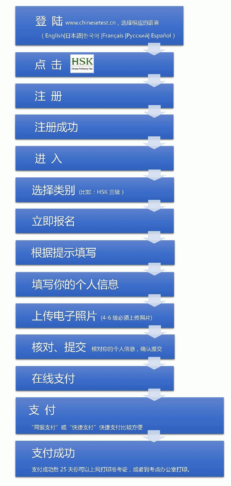 考点承办HSK网考服务,报名网址: http//www.chinesetest.cn ,报名时考生可选择自己熟悉的语种(英语、法语、俄语、日语、韩语等),然后根据提示正确填写考生信息并上传电子照片。报名成功后,请通过网银缴纳考试费。具体步骤请参考以下链接: