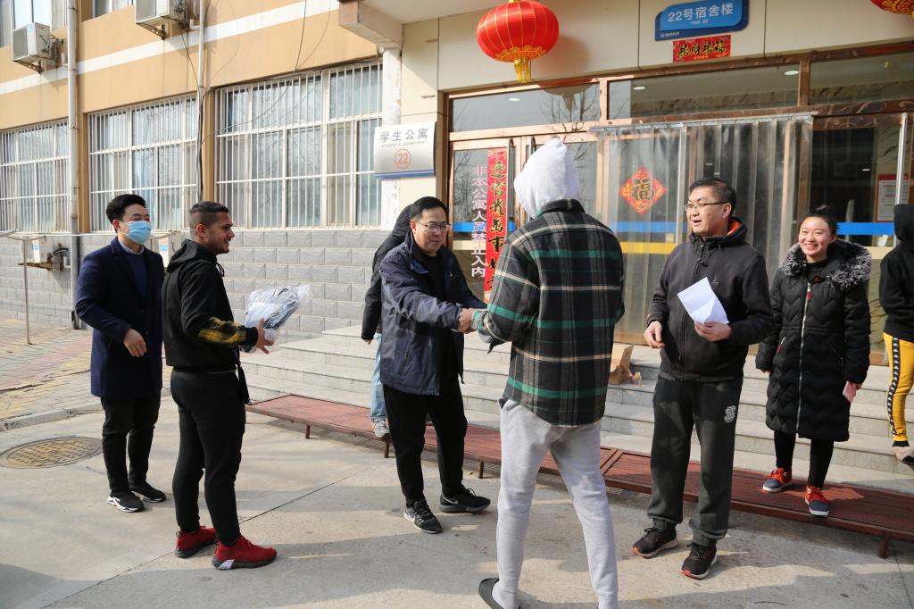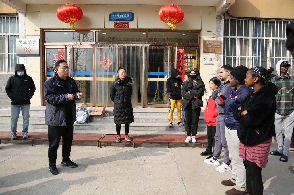 在疫情防控工作中取得的成绩,对积极参与防疫工作的留学生提出表扬,就留学生常态化防疫事宜提出具体要求。耿辉建还就春季开学大扫除活动进行了动员,希望通过此次活动,留学生养成保持卫生的良好习惯,热爱经贸,快乐留学。副院长樊国平就新学期留学生教学、留学生服务、安全等事项进行了通报。