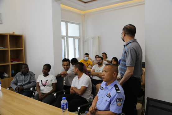 本次讲座邀请到了国安消防教育服务中心的杨教官。他就公寓用电安全、灭火中常见问题处置及常用灭火工具的操作使用进行了讲解,通过一个个真实的案例和一系列触目惊心的照片、视频,详细介绍了火灾隐患、火灾预防、火场逃生的基本知识、灭火器的正确使用方法以及正确报警等相关知识。随后新华区公安分局五七路派出所民警高春萌警官强调了涉外管理工作的重要性与严肃性,要求留学生要提高遵守中国法律法规的意识,用具体生动的案例提醒留学生防范日常生活中的安全隐患,尤其是预防电信诈骗。