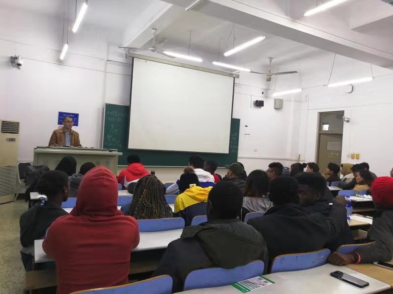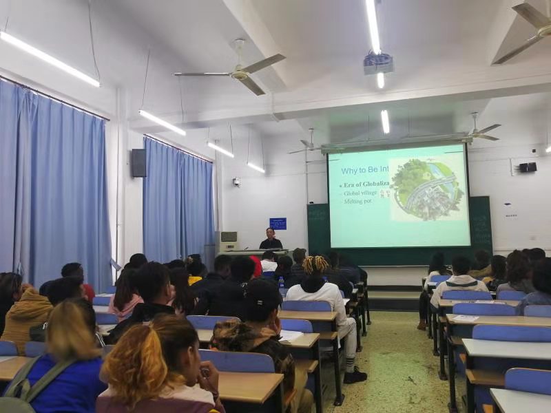 组织留学生在B教303教室举办来华留学生心理健康讲座。石家庄市公安局新华分局五七路派出所民警高春萌、公共管理学院心理学博士李万县、天美传媒