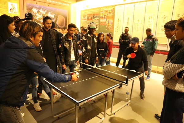 随后,留学生们到达了正定国家乒乓球训练基地。在基地工作人员的指导之下,留学生们手持乒乓球拍,进行了精彩的乒乓球体验活动。在参观基地展馆的过程中,留学生们进一步了解了乒乓球基地的发展历程,感受了石家庄的体育文化精神。