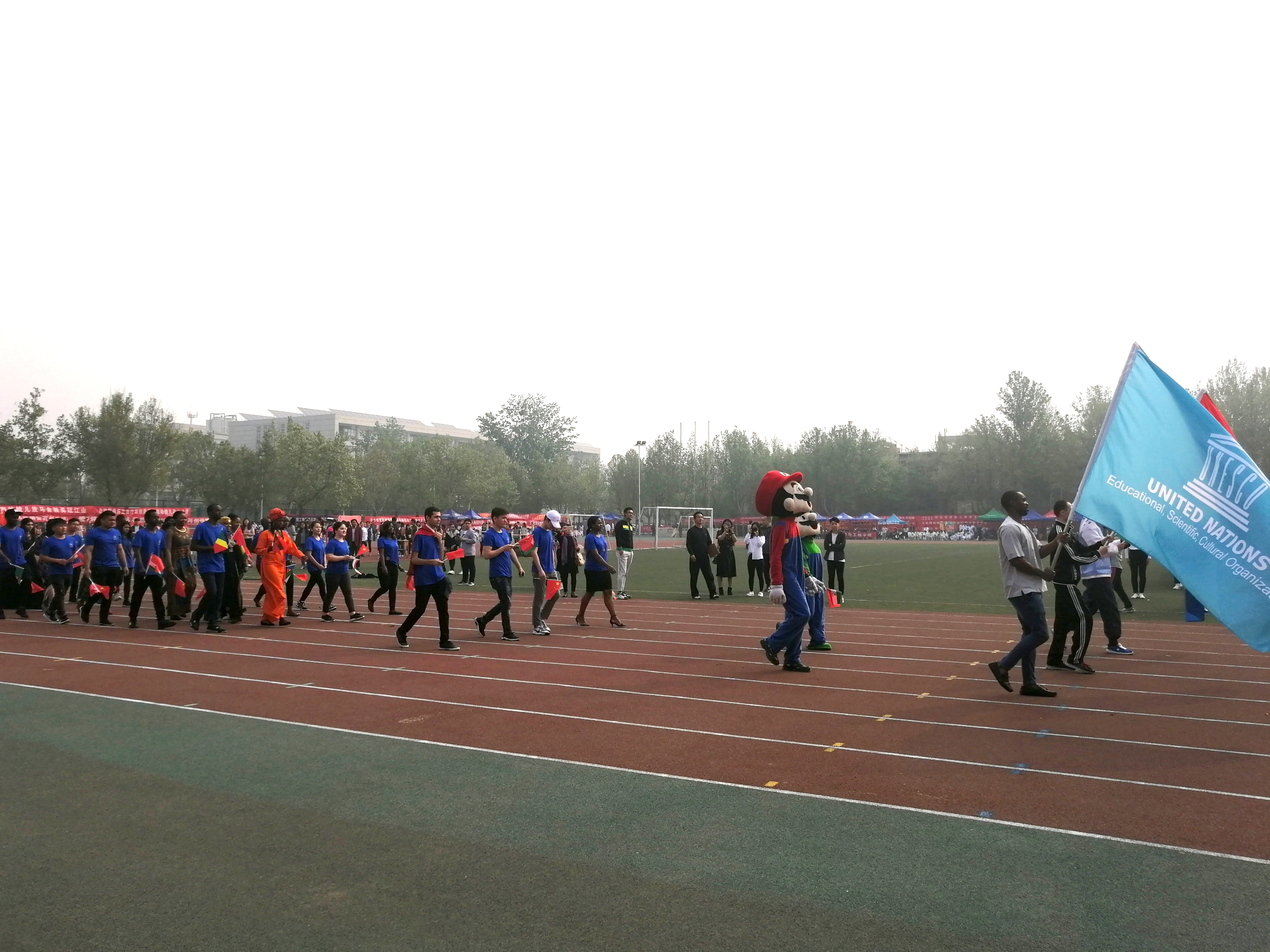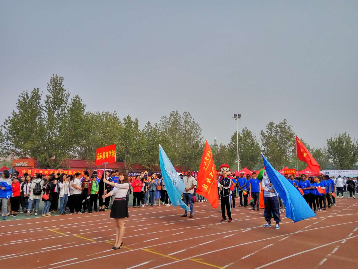 第二十三届田径运动会开幕,来自世界五大洲38个国家的我院留学生身着蓝色院服,手拿中国国旗和本国国旗,迈着整齐的步伐参加了开幕式。