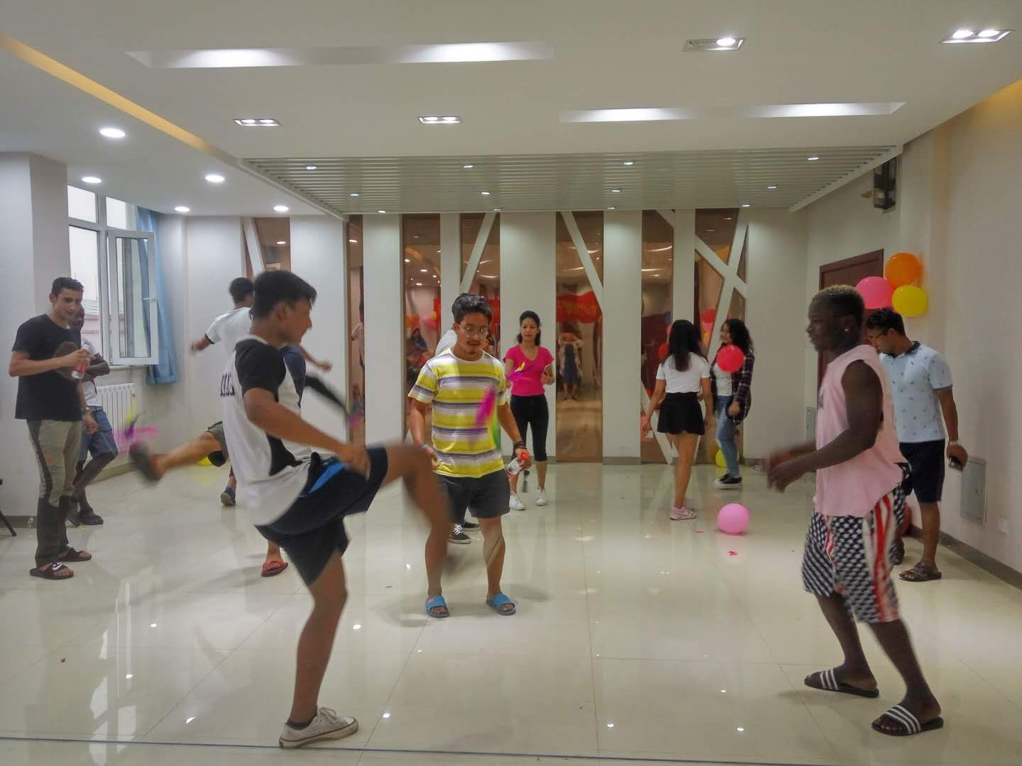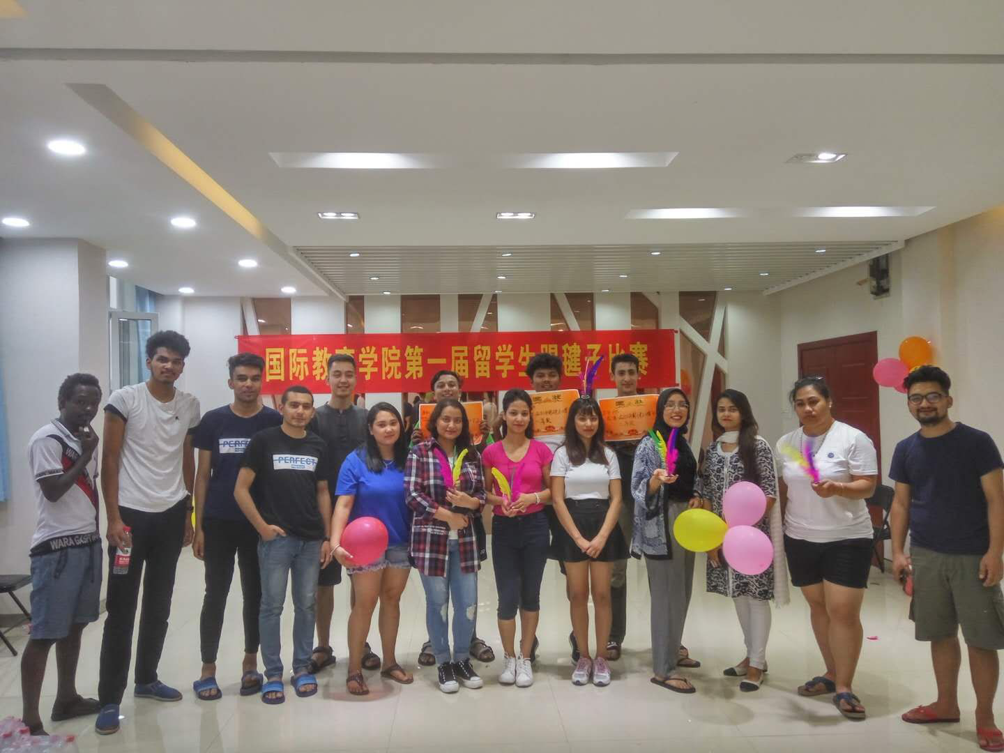 活动在留学生公寓五楼大厅拉开帷幕,比赛规则是:学生在一分钟内踢毽子数目多者获胜。12名来自不同国家的参赛同学踊跃参加。经过一番激烈比拼,陈光获得一等奖,常帅、黎帆获得二等奖,聪明、帕提玛、于杰获得三等奖,活动在欢声笑语中圆满结束。