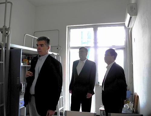 陈亮和代表团首先参观了留学生的宿舍,良好的卫生状况和完备的电器设施给他们留下了深刻的印象。接下来他们参观了留学生宿舍的公共厨房,并就留学生宿舍的使用情况与中外师生进行了深入的交流。