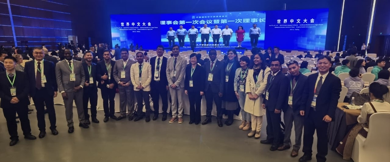 李晓华书记、李桂君校长与印度教育工作者代表团在2024世界中文大会开幕式上亲切合影