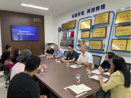 召开来华留学生安全警示教育大会。学院党委书记王冬坡、赵佗路派出所警官高春萌、来自学校安全工作处、新闻与文化传播学院等教师代表、以及全体留学生参加本次会议。